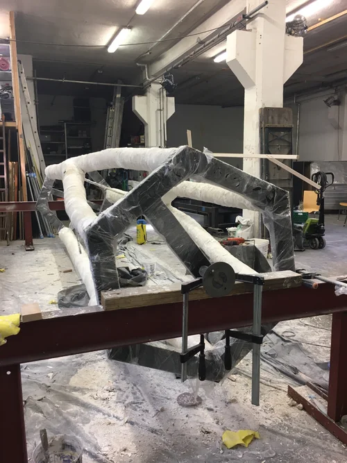 Die Plane am Werkstattcontainer von Venske & Spänle erweitert den Raum der Kiesfläche in die Wüste hinein. Der Blick auf die rote Erde erinnert an Bilder der Mars-Sonde vom Nachbarplaneten. Als letztes seiner Art scheint sich eine weiße Marmorskulptur dort noch zu behaupten. Das Kollektiv ContrastPunkt macht mit ihrer „Zeitmaschine“ das Naturphänomen Camera Obscura für die Besucher*innen wahrnehmbar und der Künstler Florian Froese-Peeck installiert sein Objekt „Neue Heimat“. Eine bemannte Tauchkapsel gräbt sich durch den Kies zur Besiedelung einer neuen Welt. Mit der robusten Schutzhülle wirkt das Objekt allerdings vielmehr selbst schutzbedürftig und bewegungsunfähig wie eine Schildkröte, die auf dem Rücken liegt. Kollektiv yvjo und Christian Schnurer lassen dazu circa 200 gesammelte Statements / Forderungen zur Zukunft des Kreativquartier München über die Propagandalautsprecher eines umfunktionierten Mercedes Benz 508 Bus verkünden. Das Fahrzeug ist ausgestattet mit Nebelmaschinen, Luftturbinen und Scheinwerfern, die die Lamentofläche am Eröffnungsabend in einen „ausserirdischen“ Ort verwandeln. Dazu gesellt sich der „Exportweltmeister“, ein Trabant Bj. 1985 mit einer rosaroten Rakete als Dachlast. Mit ihm hat Christian Schnurer bei der Expedition von München nach Kiew bereits den Beweis angetreten, dass die Überwindung jeder Grenze möglich ist.